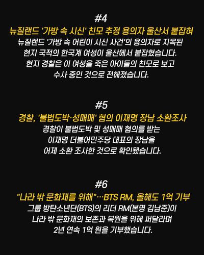 ● 뉴질랜드 '가방 속 시신' 친모 추정 용의자 울산서 붙잡혀 뉴질랜드 '가방 속 어린이 시신 사건'의 용의자로 지목된 현지 국적의 한국계 여성이 울산에서 붙잡혔습니다. 현지 경찰은 이 여성을 죽은 아이들의 친모로 보고 수사 중인 것으로 전해졌습니다.