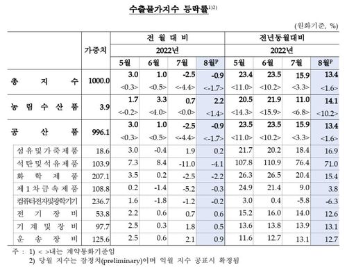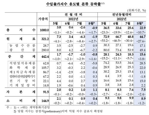 품목별로는 7월과 비교해 원재료 중 원유를 포함한 광산품(-2.2%), 중간재 중 석탄·석유제품(-5.8%)의 하락 폭이 컸다.