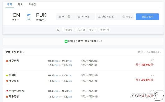16일 네이버 항공권에서 10월 7일 출발해 10일에 돌아오는 3박4일 일정의 '인천~후쿠오카' 왕복 항공권을 검색한 결과 최저 가격이 43만8000원이다.