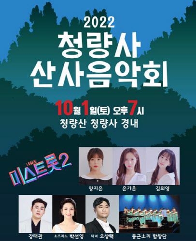 이번 음악회는 트롯 열풍의 주역들과 함께 흥겨운 무대를 꾸민다. 미스트롯2에서 진을 수상한 ‘양지은’을 필두로 매콤 보이스 ‘김의영’, 모든 장르를 섭렵한 ‘은가은’, 트롯가수이자 국악인 ‘강태관’과 함께 소리를 채우고 소프라노 박선영, 테너 오상택 그리고 청량사 둥근소리합창단이 함께한다.