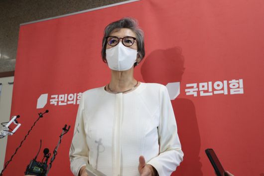 이양희 국민의힘 윤리위원장이 18일 오후 국회에서 열린 중앙당 윤리위원회 시작 전 브리핑을 하고 있다. 공동취재 |