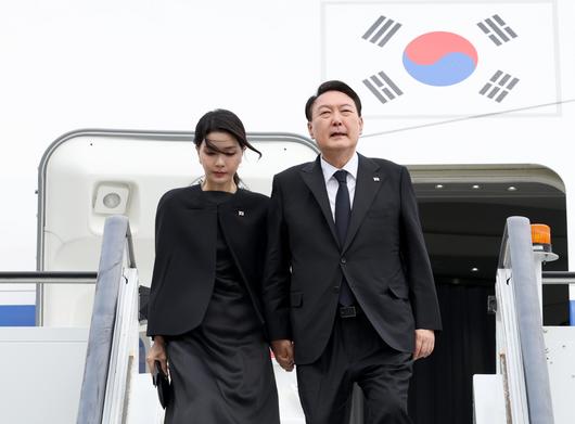 윤석열 대통령과 부인 김건희 여사가 18일(현지시간) 영국 런던 스탠스테드공항에 도착해 공군 1호기에서 내리고 있다. [연합] |