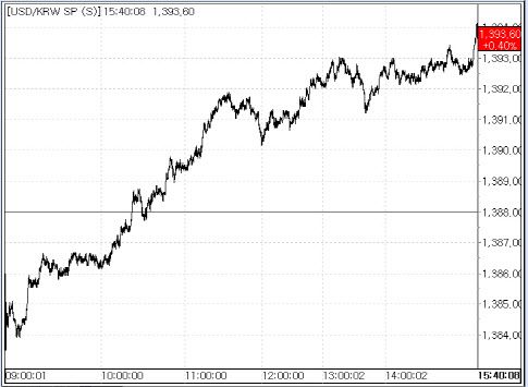 19일 서울외국환중개에 따르면 환율은 전 거래일 종가(1388.0원) 대비 5.6원 오른 1393.6원에 마감했다. 이날 환율은 개장 전 중국 위안화, 일본 엔화 반등에 전일 대비 3.0원 하락한 1385.0원에 개장한 뒤 낙폭을 점차 줄이더니 오전 10시 30분께를 기점으로 상승 반전했다. 환율이 1390원대로 오른 것은 지난 15일(1393.7원) 이후 2거래일 만이다.