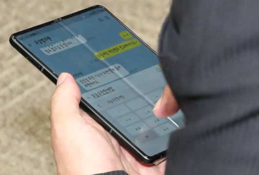 19일 오전 국회에서 열린 국민의힘 원내대표 선출을 위한 의원총회에서 촬영된 정진석 비대위원장의 휴대전화 화면에 정 비대위원장이 유상범 의원과 주고받은 문자가 보인다. 연합뉴스 |