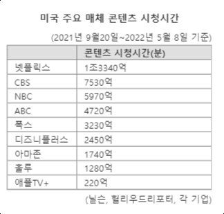 글로벌 리서치업체 닐슨이 지난해 9월 20일부터 올해 5월 8일까지 매체별 콘텐츠 시청 시간을 조사한 결과 넷플릭스가 1조3340억분으로 1위를 차지했다. 이는 TV 시청률 1위 매체인 CBS(7530억분)보다 2배, OTT 2위인 디즈니플러스(2450억분)의 5배 긴 시간이다.