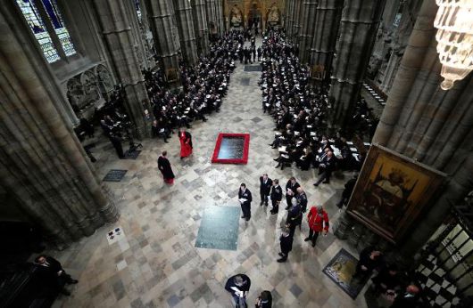 나흘간 30만명의 일반인 참배를 마친 여왕의 관은 이날 오전 11시 44분 웨스트민스터홀에서 웨스트민스터 사원으로 옮겨졌다.