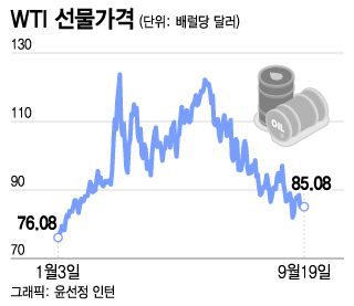 19일 인베스팅닷컴에 따르면 지난 18일 기준 서부텍사스산원유(WTI) 선물 가격은 배럴당 85.37달러로 지난 6월8일 기록한 연중 고점(122.11달러) 대비 30.1% 하락했다. 3분기 들어 꾸준히 하향세인데 정유 및 금융투자업계는 유가가 연초 수준(76.08달러)이자 러시아의 우크라이나 침공 사태 이전으로 돌아갈 수 있는지에 대해서는 업계 의견이 분분하다.