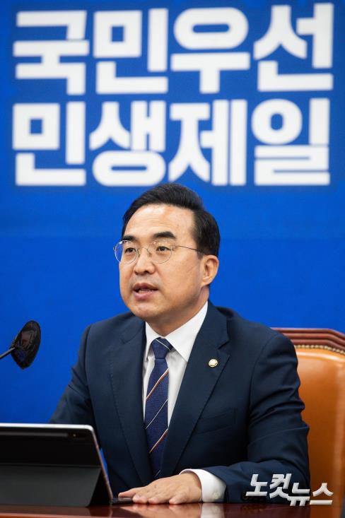 더불어민주당 박홍근 원내대표가 20일 서울 여의도 국회에서 열린 당 원내대책회의에서 모두 발언을 하고 있다.