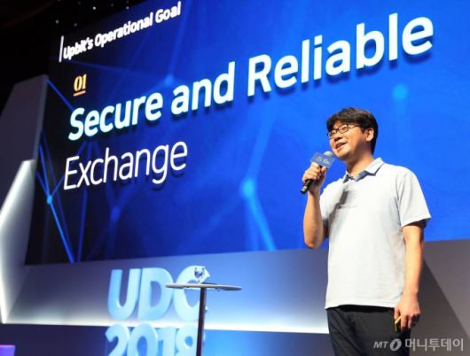 송치형 두나무 이사회 의장이 13일 제주국제컨벤션센터(ICC JEJU)에서 열린 '업비트 개발자 컨퍼런스 2018(Upbit Developer Conference 2018·UDC 2018)'에서 기조연설을 하고 있다. / 사진제공=두나무 |