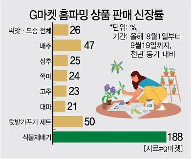 이 중 온라인몰에서 홈파밍 관련 상품 인기가 뜨겁다. G마켓에서 8월 1일부터 9월 19일까지 전체 채소 씨앗·모종 매출액은 전년 동기 대비 26% 신장했다. 품목별 매출 성장률은 배추(47%)가 가장 높았고 상추(25%), 쪽파(24%), 고추(23%), 대파(21%)가 뒤를 이었다.