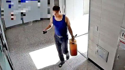 지난 18일 오전 경남 진주의 한 변호사 사무실에 40대 남성이 기름통을 들고 출입을 시도하고 있다. 사진 독자 |