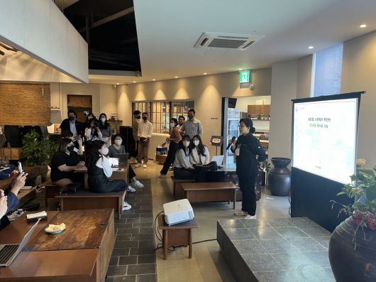 21일 경기도 앨리웨이 광교 채식 레스토랑 '두수고방'에서 열린 '오뚜기 두수고방' 출시 간담회에서 구현희 오뚜기 책임연구원이 제품을 소개하고 있다. |