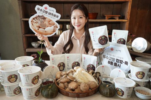 첫 제품은 ‘컵밥’과 ‘죽’이다. 오뚜기는 21일 경기도 수원에 위치한 앨리웨이 광교 두수고방에서 총 8종의 제품을 공개했다. 두수고방 시리즈는 △산채나물 비빔밥 △버섯들깨미역국밥 △시래기 된장국밥 △모둠버섯밥 등 컵밥 4종과 △수수팥범벅 △들깨버섯죽 △된장보리죽 △흑임자죽 등 죽 4종이다. 두수고방 컵밥은 국내에서 처음으로 시도되는 채식 제품이다.