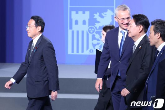윤석열 대통령과 기시다 후미오 일본 총리가 29일 오후(현지시간) 스페인 마드리드 이페마(IFEMA) 컨벤션센터에서 아시아 태평양 파트너 4개국 정상-옌스 스톨텐베르그 나토(NATO·북대서양조약기구) 사무총장과의 기념촬영을 마친 후 단상에서 내려오고 있다. (대통령실사진기자단) 2022.6.29/뉴스1 ⓒ News1 오대일 기자 |