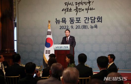 [뉴욕=뉴시스] 홍효식 기자 = 윤석열 대통령이 20일(현지시간) 뉴욕 시내 한 연회장에서 열린 뉴욕 동포 간담회에서 격려말을 하고 있다. 2022.09.21. yesphoto@newsis.com |