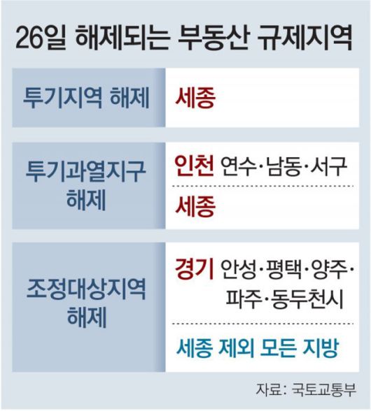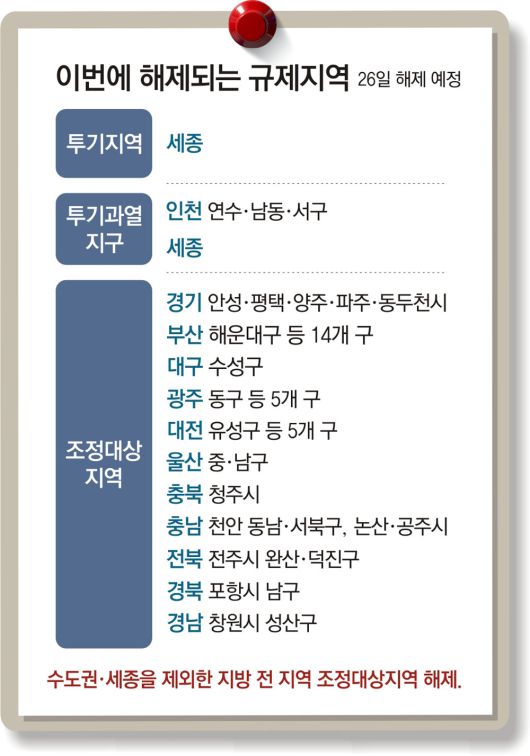 세종시를 제외한 지방 모든 지역이 규제지역에서 해제된다. 수도권에서 인천이 투기과열지구에서 벗어나고, 경기 평택시와 파주시 등 일부 지역도 조정대상지역에서 풀리며 대출·세금 규제가 대폭 완화된다.