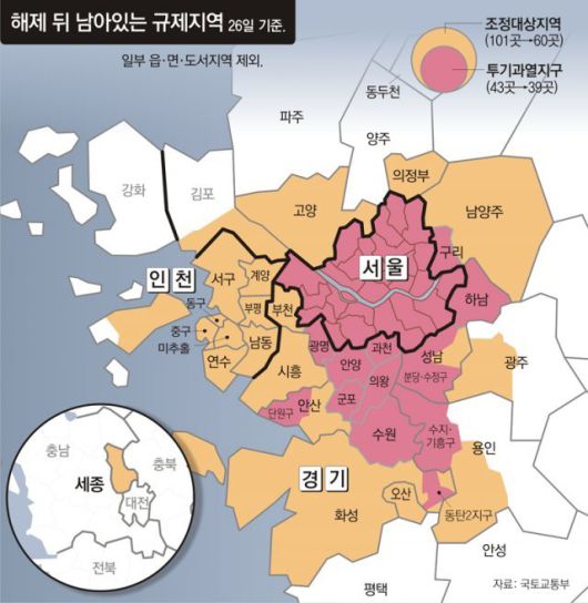 이번에 투기과열지구에서 해제된 곳은 인천 연수구 남동구 서구, 세종시로 투기과열지구는 43곳에서 39곳으로 줄면서 15억 원 초과 주택도 주택담보대출을 받을 수 있게 된다. 다만 이들 지역에 조정대상지역은 유지된다. 주택담보인정비율(LTV) 한도(집값 9억 원 이하)는 소폭(40%→50%) 완화된다.