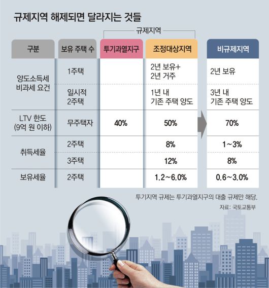 세종시를 제외한 지방과 경기 평택 안성 양주 파주 동두천시 등은 조정대상지역에서 해제되면서 세금 대출 청약 등 규제가 대폭 완화된다. 주택을 매수할 때는 LTV가 최대 70%까지 적용된다. 2주택자가 될 때 취득세도 8%에서 1∼3%로 낮아진다. 민영주택 추첨제 비율도 전용 85m²까지 60%로 늘어나고 전용 85m²를 초과하면 100% 추첨제가 적용된다. 1가구 1주택자가 양도소득세 비과세를 받을 때 거주할 필요 없이 2년만 보유하면 된다.