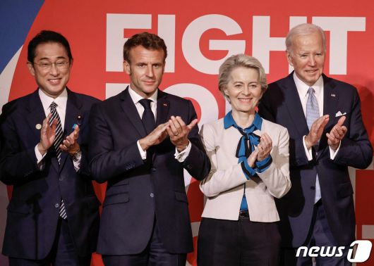 조 바이든 미국 대통령과 에마뉘엘 마크롱 프랑스 대통령, 기시다 후미오 일본 총리, 우르줄라 폰데어라이엔 EU 집행위원장이 21일(현지시간) 뉴욕에서 에이즈·결핵·말라리아 등 감염병 퇴치 기금 마련을 위한 글로벌 펀드 7차 재정 조달 회의서 박수를 치고 있다. ⓒ AFP=뉴스1 ⓒ News1 우동명 기자 |