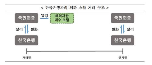 국민연금은 달러를 받으면서 거래일 환율을 적용한 원화를 한국은행에 지급하고, 만기일에는 달러를 상환하면서 거래일의 스와프 포인트(선물 환율과 현물 환율의 차이)를 감안한 환율을 적용해 산출된 원화를 돌려받는다.