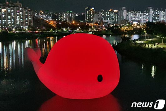 (울산=뉴스1) 윤일지 기자 = 23일 오후 울산 태화강 십리대밭교 아래 설치된 대형 고래 조형물 '러브웨일'이 환하게 빛나고 있다. 상괭이 모양의 대형 고래 조형물 '러브웨일'은 울산고래축제가 끝나는 10월 16일까지 태화강 십리대밭교 아래 전시된다. 2022.9.23/뉴스1Y1G@news1.krCopyright ⓒ 뉴스1. All rights reserved. 무단 전재 및 재배포 금지.