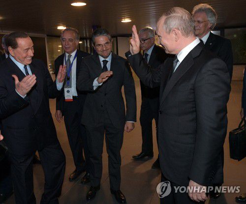 2019년 7월 푸틴 대통령(오른쪽)과 반갑게 인사하는 베를루스코니 전 총리 |