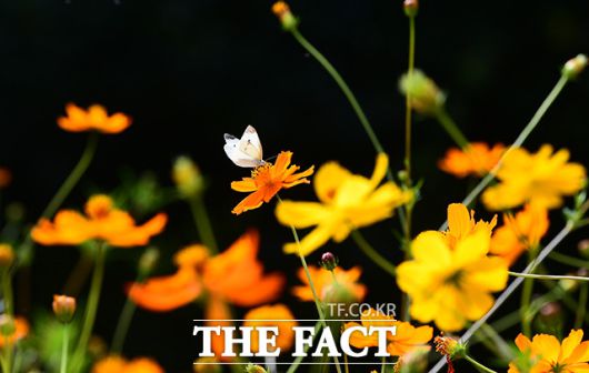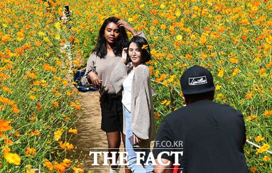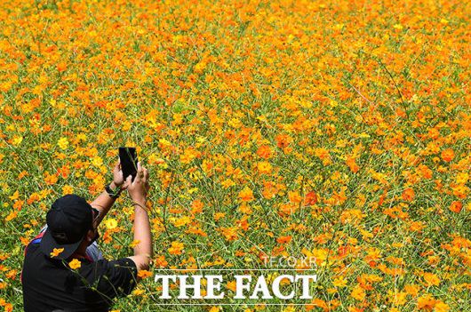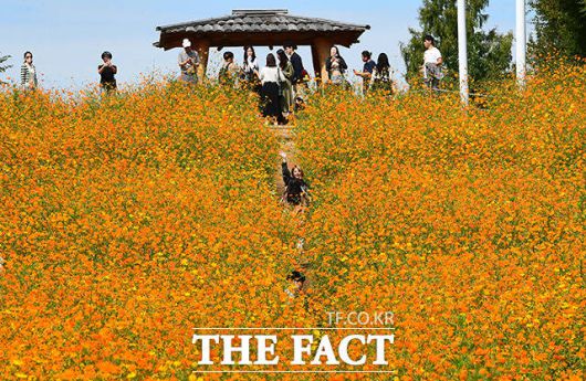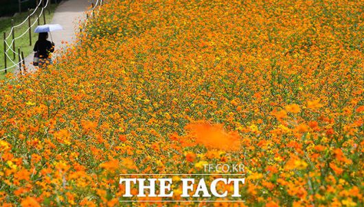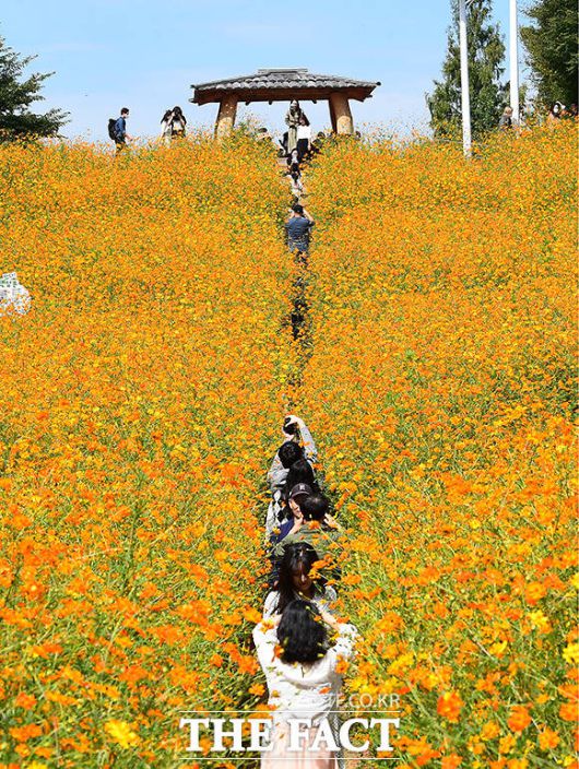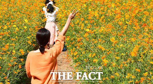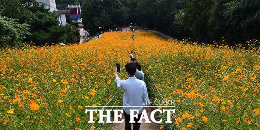 [더팩트ㅣ이동률 기자] 완연한 가을 날씨를 보인 25일 오전 서울 송파구 올림픽공원 들꽃마루를 찾은 시민들이 황화코스모스밭을 거닐며 가을을 만끽하고 있다.