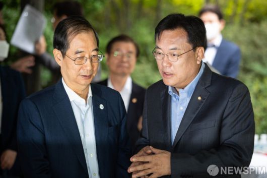 [서울=뉴스핌] 정일구 기자 = 한덕수 국무총리와 정진석 국민의힘 비상대책위원장이 25일 오전 서울 종로구 국무총리 공관에서 열린 제4차 고위당정협의회에서 대화를 나누고 있다. 2022.09.25 mironj19@newspim.com |