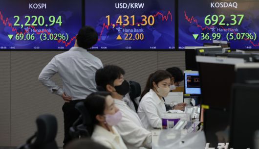 26일 코스피가 3% 넘게 폭락하며 2년 2개월여 만에 최저치로 마감했다. 코스닥지수는 692.37에 마감했다. 코스닥지수가 700선 아래에서 마감한 것은 2년 3개월여만이다. 이날 원/달러 환율은 20원 넘게 급등하며 13년 반 만에 1430원대까지 오른 채 마감했다. 26일 오후 서울 중구 하나은행 딜링룸에서 직원들이 분주히 움직이고 있다. 연합뉴스