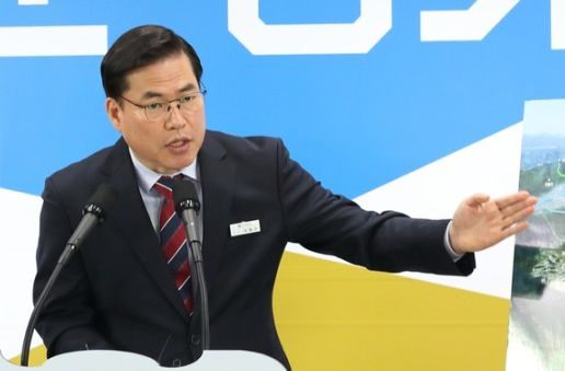 지난 2019년 3월 6일 유동규 당시 경기관광공사 사장이 경기도청 구관 2층 브리핑룸에서 임진각~판문점 간 평화 모노레일 설치 추진 계획에 대해 브리핑을 하고 있다. 경기도 제공 |