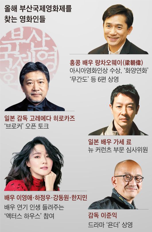 우선 홍콩 영화의 간판 배우 량차오웨이 등 해외 영화인들의 방한이 대부분 재개됐다. 올해 예순을 맞은 량차오웨이는 2000년 ‘화양연화(花樣年華)’로 칸 영화제 남우주연상을 받은 명배우. 그의 출연작인 ‘비정성시’(1989년)와 ‘씨클로’(1995년) ‘색, 계’(2007년) 등 세 편이 모두 베네치아 영화제 최고상인 황금사자상을 받았다. 올해의 아시아영화인상 수상자로 선정된 그는 ‘동성서취’ ‘해피 투게더’ ‘암화’ ‘화양연화’ ‘무간도’ ‘2046′ 등 직접 선정한 대표작 6편을 상영하는 시간을 갖는다. 7일 오후 5시에는 부산영화의전당 야외 무대에서 관객들과도 만난다. 친한파(親韓派) 일본 감독 고레에다 히로카즈와 일본 배우 가세 료 등도 레드 카펫을 밟는다.
