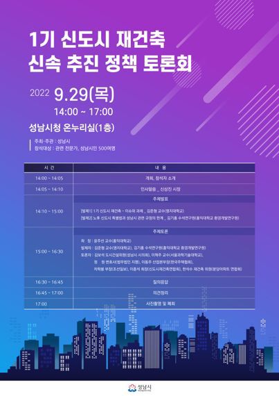 【파이낸셜뉴스 성남=장충식 기자】 경기도 성남시는 오는 29일 오후 2시~5시 시청 1층 온누리에서 ‘1기 신도시 재건축 신속 추진을 위한 정책토론회’를 개최한다고 27일 밝혔다.
