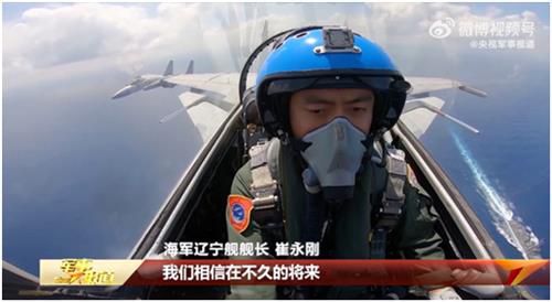 영상에는 랴오닝함 함재기 J-15 한 대가 바다 위를 항행하는 구축함 상공에서 일정 거리를 유지하며 근접 비행하는 모습이 담겼다.