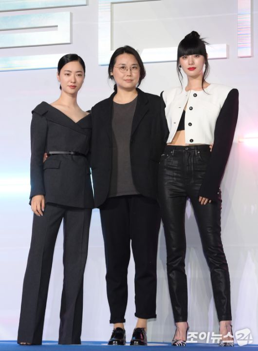 전여빈-노덕 감독-나나가 27일 오전 서울 CGV 용산아이파크몰에서 열린 넷플릭스 시리즈 '글리치' 제작발표회에 참석해 포토타임을 갖고 있다. [사진=정소희 기자] |