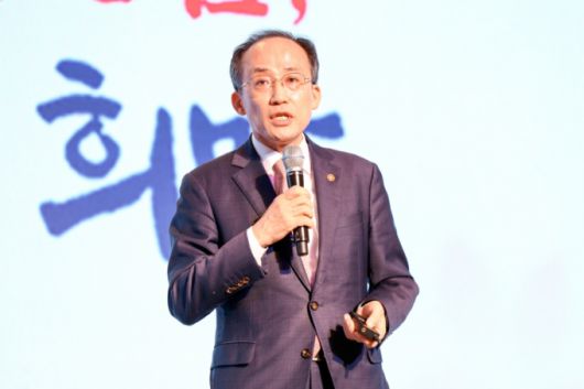 1시간 가량 진행된 강연에서 추 부총리는 중소기업인들에게 10여차례 박수를 받았다. '대한민국 경제의 희망찬 미래'를 주제로 진행된 강연에선 △중대재해처벌법 처벌기준 명확화 △주52시간 근로제 완화 △법인세 인하 △기업상속 기준 완화 등을 언급하자 박수가 터져나왔다. 주요 강연 내요은 규제완화를 골자로 한 새 정부 정책 방향이다.