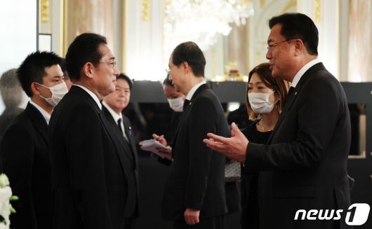 (도쿄=뉴스1) 박지혜 기자 = 정진석 국회부의장이 7일 오후 도쿄 아카사카 영빈관에서 열린 환영 연회(리셉션)에 참석해 기시다 후미오 일본 총리와 인사를 나누고 있다. 2022.9.27/뉴스1pjh2580@news1.krCopyright ⓒ 뉴스1. All rights reserved. 무단 전재 및 재배포 금지.