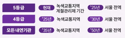 이에 서울시는 2025년 4등급 차량의 녹색교통지역 운행을 제한하고 2030년 서울 전역으로 확대한다. 현재는 5등급 차량에 한해 녹색교통지역은 연중, 서울 전역은 계절관리제 기간(12~3월) 운행제한을 실시하고 있다. 시는 내년 하반기부터 비상저감조치 발령시 운행제한을 시범적으로 시행한 이후 대상차량, 세부방법 등 구체적인 실행방안을 마련한다는 계획이다.