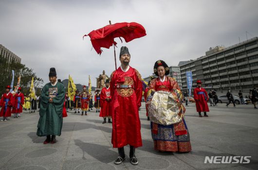 [서울=뉴시스] 정병혁 기자 = 28일 오전 서울 종로구 광화문광장에서 세종대왕 어가행차가 이동하고 있다. 이번 세종대왕 어가행차는 오는 10월 7일 청주에서 열리는 2022 세종대왕과 초정약수축제를 앞두고 진행됐다. 2022.09.28. jhope@newsis.com
