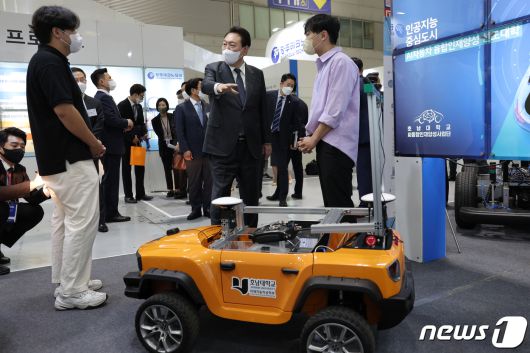 (서울=뉴스1) 오대일 기자 = 윤석열 대통령이 28일 광주 서구 김대중컨벤션센터에서 열린 제8차 비상경제민생회의에 앞서 인공지능 전시회 '2022 AI TECH+'를 찾아 호남대 부스에서 학생들과 대화를 나누고 있다. (대통령실 제공) 2022.9.28/뉴스1kkorazi@news1.krCopyright ⓒ 뉴스1. All rights reserved. 무단 전재 및 재배포 금지.