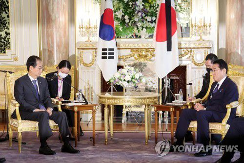 (도쿄=연합뉴스) 박성진 이세원 특파원 한혜원 기자 = 한덕수 국무총리와 기시다 후미오(岸田文雄) 일본 총리가 28일 만나 강제징용 배상 문제 해법 모색을 포함한 한일 관계 개선 방안을 논의했다.