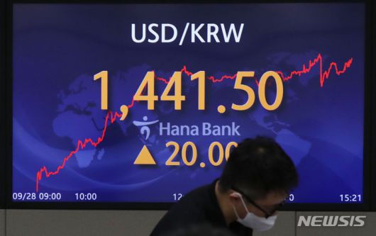 28일 서울 외환시장에서 원·달러 환율은 전 거래일(1421.5원) 보다 18.4원 오른 1439.9원에 거래를 마쳤다. 2009년 3월 16일(1440.0원) 이후 13년 6개월래 가장 높은 수준이다.