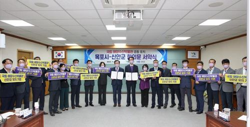 (신안=연합뉴스) 조근영 기자 = 전남 신안군과 목포시는 29일 목포시청에서 '국립 해양수산박물관 공동 유치를 위한 합의문 서약식'을 가졌다.
