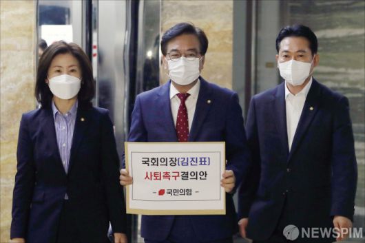 [서울=뉴스핌] 최상수 기자 = 국민의힘 송언석 원내수석부대표, 김미애, 장동혁 원내대변인이 30일 오전 서울 여의도 국회 의안과에 김진표 국회의장 사퇴 촉구 결의안을 제출하기 위해 이동하고 있다. (공동취재사진) 2022.09.30 photo@newspim.com 저작권자(c) 글로벌리더의 지름길 종합뉴스통신사 뉴스핌(Newspim), 무단 전재-재배포 금지
