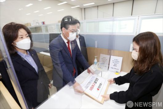 [서울=뉴스핌] 최상수 기자 = 국민의힘 송언석 원내수석부대표, 김미애, 장동혁 원내대변인이 30일 오전 서울 여의도 국회 의안과에 김진표 국회의장 사퇴 촉구 결의안을 제출하고 있다. (공동취재사진) 2022.09.30 photo@newspim.com