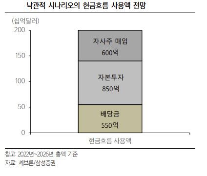 셰브론이 배당금 외에도 자사주 매입에 적극적이라는 점도 주목할 대목이다. 그는 “셰브론은 브렌트유가 75달러를 상회할 경우 연간 400억원 수준의 현금흐름이 유입될 것으로 보고 있다”며 “이는 주당 5.5달러의 배당은 물론 연간 100억 달러를 상회하는 자사주 매입도 가능한 수준”이라고 분석했다.