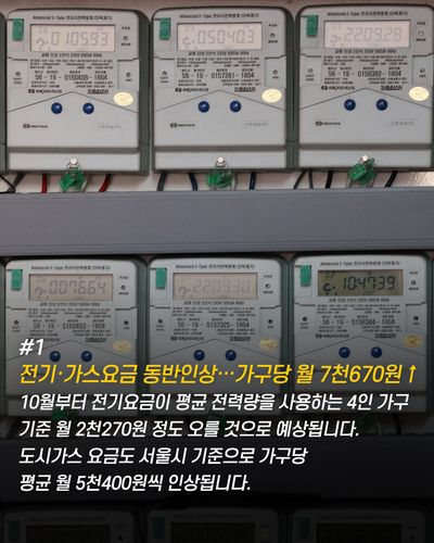 ● 10월부터 전기·가스요금 동반인상…가구당 월 7천670원↑ 10월부터 전기요금이 평균 전력량을 사용하는 4인 가구 기준 월 2천270원 정도 오를 것으로 예상됩니다. 도시가스 요금도 서울시 기준으로 가구당 평균 월 5천400원씩 인상됩니다.