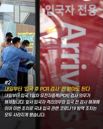 ● '입국 후 PCR 검사' 안 받아도 된다…요양병원 접촉면회 재개 내일부터 입국 1일차 유전자증폭(PCR) 검사 의무가 해제됩니다. 앞서 입국자 격리의무와 입국 전 검사 해제에 이어 이번 조치로 국내 입국 관련 코로나19 방역 조치는 모두 사라지게 됐습니다.