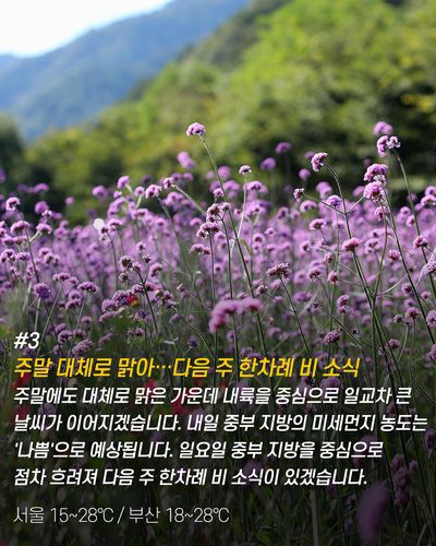 ● 주말 대체로 맑아…다음 주 한차례 비 소식 주말에도 대체로 맑은 가운데 내륙을 중심으로 일교차 큰 날씨가 이어지겠습니다. 내일 중부 지방의 미세먼지 농도는 '나쁨'으로 예상됩니다. 일요일 중부 지방을 중심으로 점차 흐려져 다음 주 한차례 비 소식이 있겠습니다.