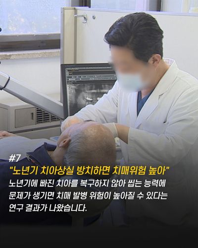 ● "노년기 치아상실 방치하면 치매위험 높아" 노년기에 빠진 치아를 복구하지 않아 씹는 능력에 문제가 생기면 치매 발병 위험이 높아질 수 있다는 연구 결과가 나왔습니다.