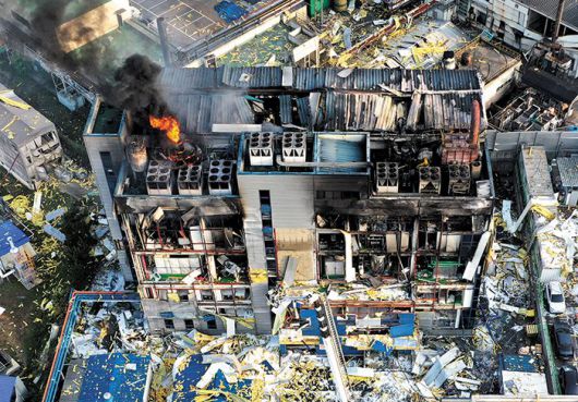 30일 오후 경기 화성시 향남읍 상신리 화일약품 공장에서 폭발로 불이 나 화염이 치솟고 있다. 폭발 당시 충격으로 공장 건물 외벽 등이 부서져 잔해들이 폭격을 맞은 것처럼 주변에 흩어져 있다. 이날 오후 2시 22분쯤 이 공장 3층에서 시작된 불로 29세 남성 1명이 숨지고 15명이 다쳤다. 부상자 중 1명은 머리를 다치는 중상을 입었다. 소방 당국은 제약 공단 안에서 폭발음이 들린다는 119 신고를 접수하고 펌프차 등 장비 64대와 소방관 등 인력 142명을 투입해 진화에 나섰고, 오후 6시 23분쯤 불을 모두 껐다. 화일약품은 원료 의약품과 완제 의약품 등을 생산하는 업체다. 불이 난 공장에는 톨루엔, 아세톤 등 휘발성이 강한 화학물질이 보관된 것으로 알려졌다. 소방 당국은 “3층에서 아세톤을 취급하다 원인 미상의 폭발로 화재가 발생한 것으로 추정된다”고 밝혔다.